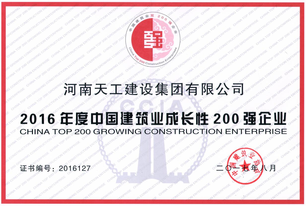 2016年度中国建筑业成长性200强企业(证书)