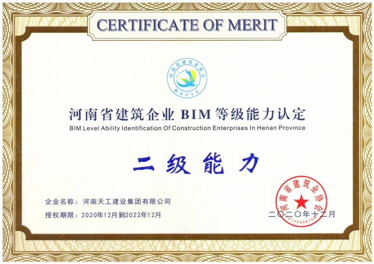 河南天工建设集团BIM能力被认定为 “河南省建筑企业BIM等级能力认定二级能力”